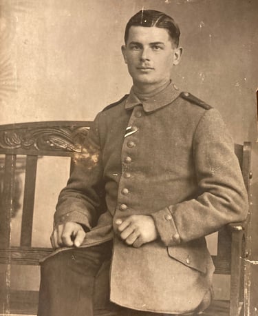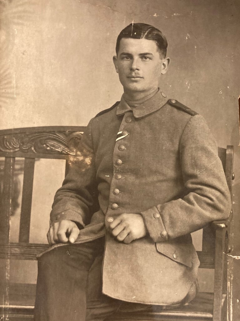 Il a servi pendant la 1ère Guerre Mondiale. Né allemand, il a donc servi comme ses camarades alsaciens dans l’armée allemande. La recherche de son dossier allemand s’est avérée vaine. Les archives de la Wehrmacht ont brûlé à Potsdam durant la 2nde Guerre mondiale. Son dossier français reconstitué ne fait pas état de son passage dans l’armée allemande. Je tiens néanmoins pour preuve son passage dans l’armée allemande des photos et courriers personnels qui lui étaient adressés.